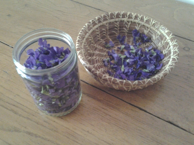 The violets I gathered came home in a basket and wilted in the sun.  I covered them with gently warmed grapeseed oil and left them to steep; the oil will take on their velvety purple color and absorb their emollient, soothing, anti-inflammatory properties.  I like to make this oil into salve with beeswax and perhaps infused chickweed or plantain oil; or blend it with lavender-infused vinegar for a beautifully colored, delicious,  healing vinaigrette.